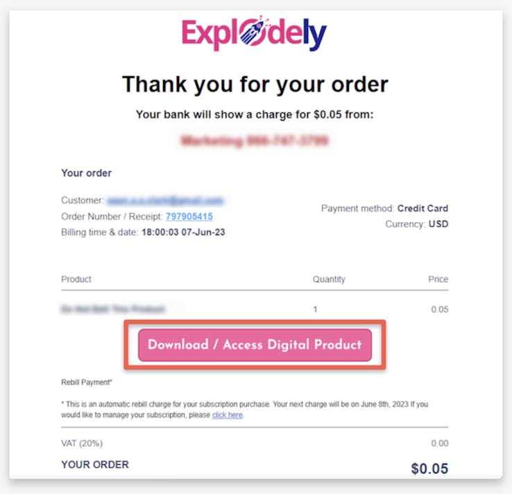 - Please check your email inbox for a message from Explodely. This email contains your invoice and the access details for your product.